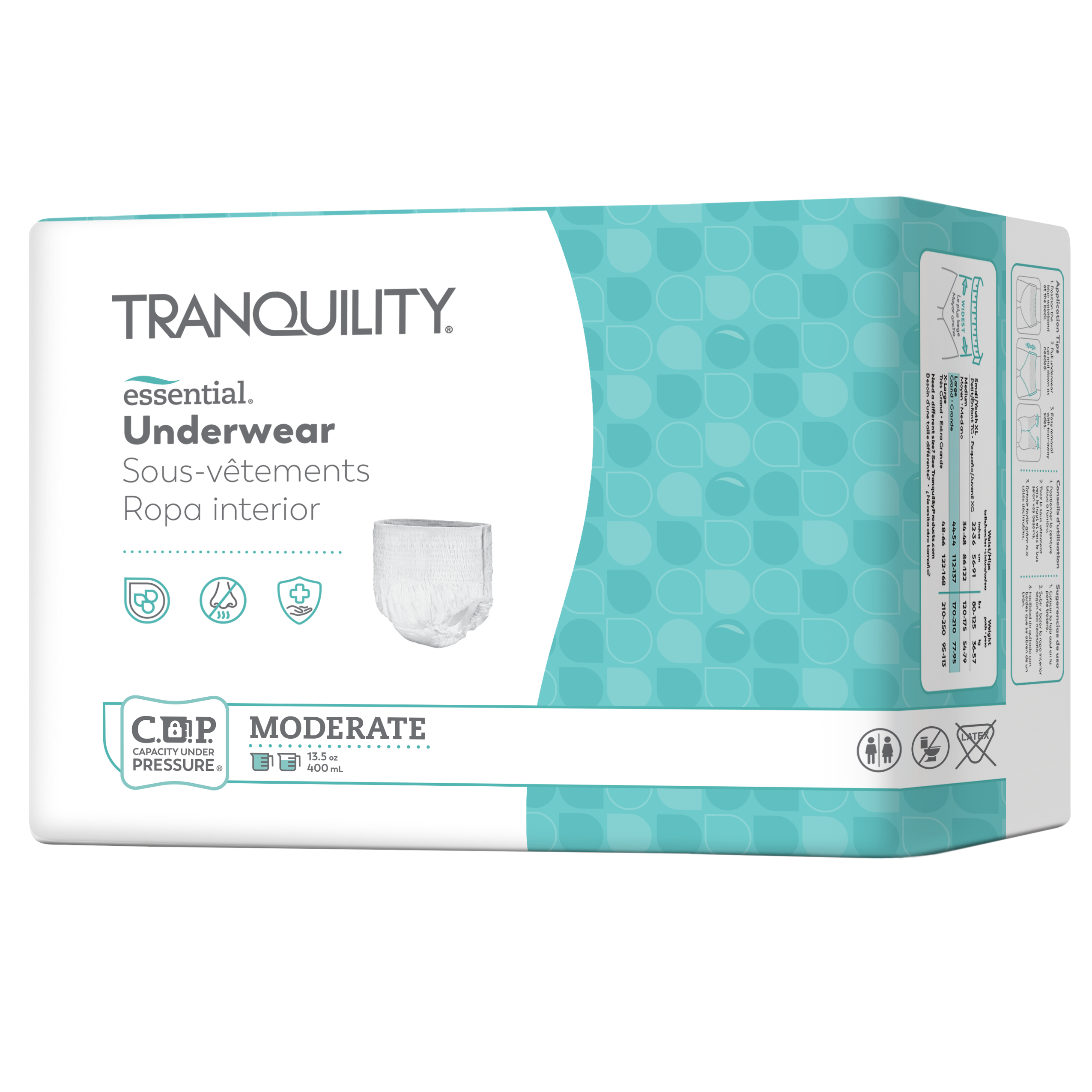 Tranquility® Essential Underwear are a soft and breathable, pull-on style absorbent product that are perfect for those who rely on secure protection from moderate incontinence leaks when and where they need it. These underwear feature clothlike breathability and a full-rise fit providing all-day comfort with an absorbency capacity between 299ml – 400ml. Additionally, the feature of uniquely designed Kufguards® channel and lock in fluid to keep the wearer dry. This absorbent underwear is recommended for individuals with moderate incontinence. Not made with natural rubber latex.